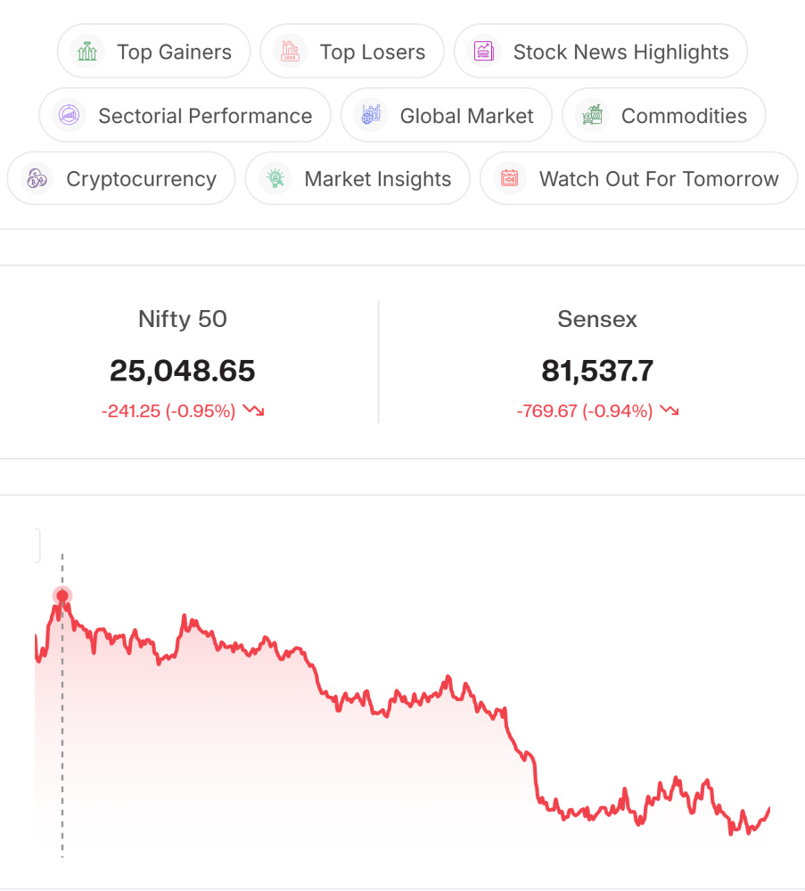 Advance-Decline Ratio: Market breadth turned negative today, with declines 2,301 outpacing advances 880, indicating broad-based selling across the market.