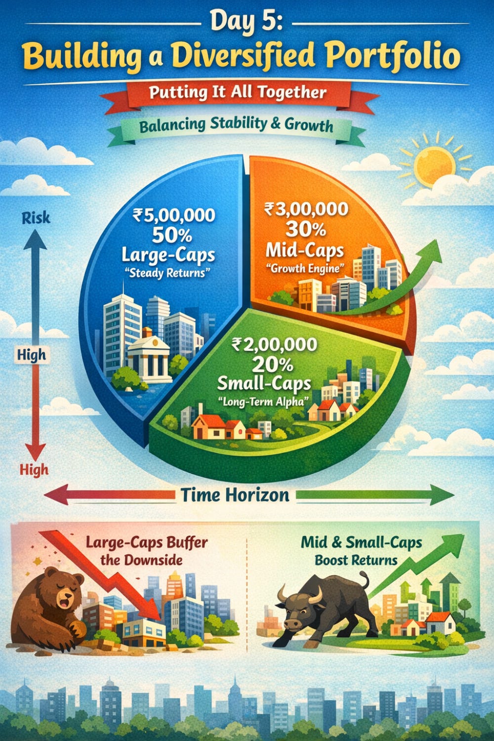 Diversification balances stability and growth by allocating capital across market caps based on risk appetite and time horizon.