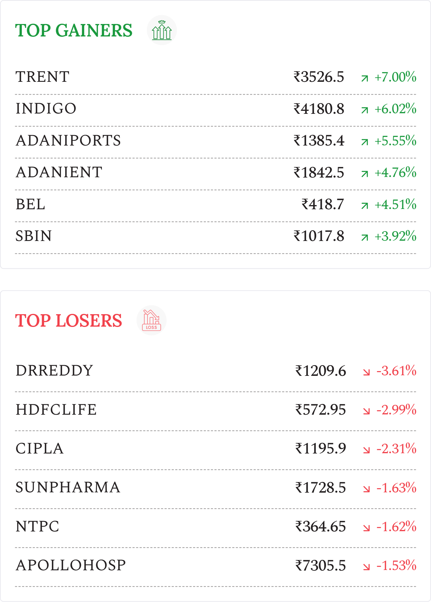Bharat Electronics (+4.51%): Shares gained after the company secured additional defence orders worth ₹6,795 crore from the Ministry of Defence and other contracts, strengthening its order book and boosting investor sentiment.