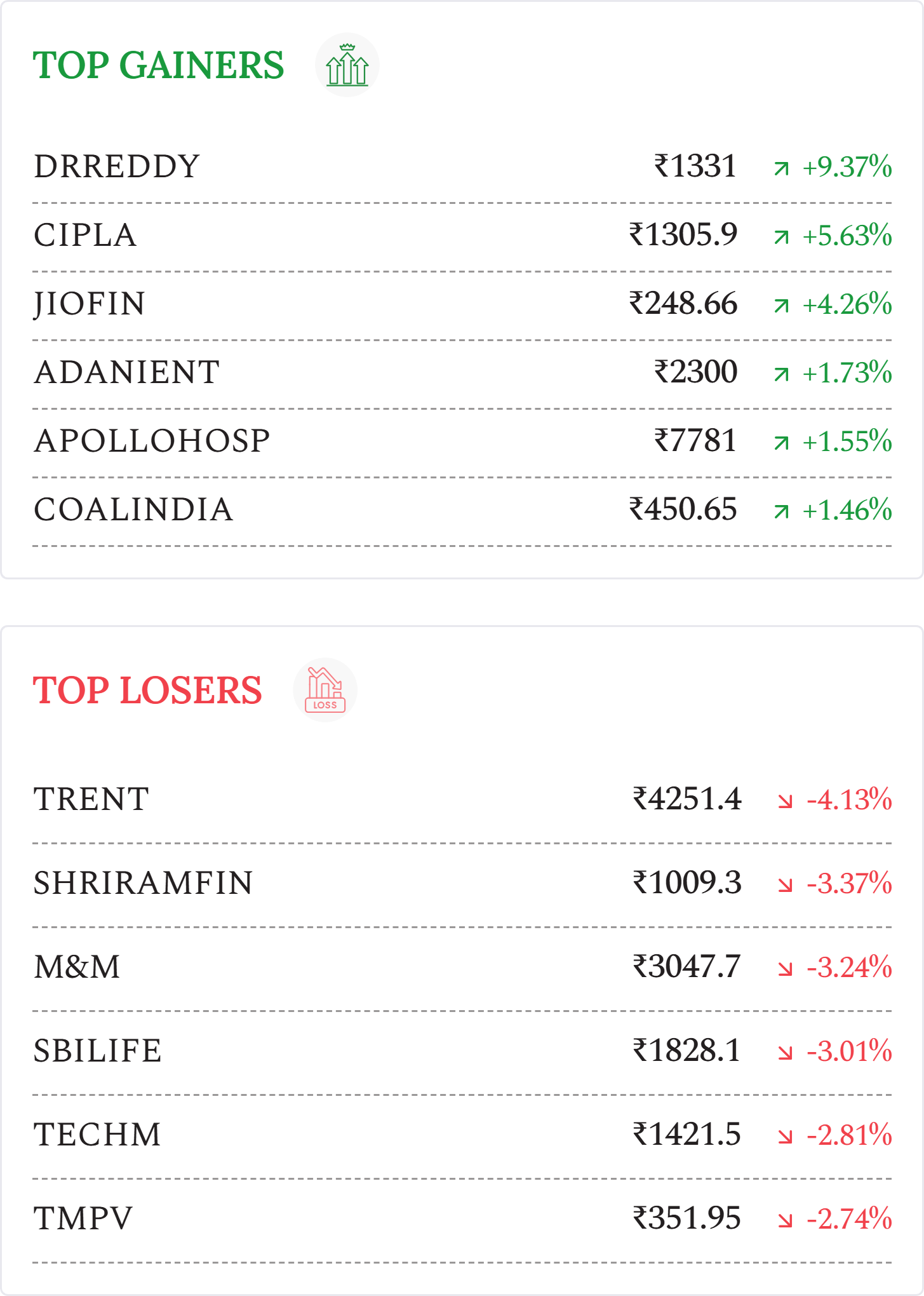 Jio Financial Services (+4.26%): Stock gained after entering 50:50 insurance JV with Allianz Group, expanding into general and health insurance, pending regulatory approvals.