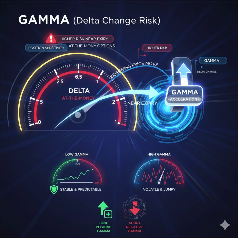 What it means: Gamma shows how quickly Delta changes when the underlying price moves, indicating position sensitivity and higher risk near expiry, especially for at-the-money options.