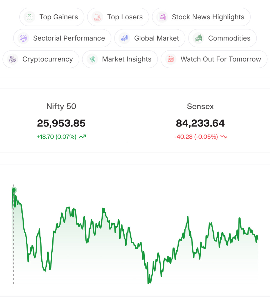 Index Watch: Nifty closed Wednesday at 25,953.85, up 18.70 points, hovering near the 26,000 mark. For Thursday, resistance is seen at 26,000–26,050, where selling pressure may persist. Immediate support lies at 25,900–25,850. Holding above support keeps the bias positive, while a breakout above resistance may trigger further upside momentum.