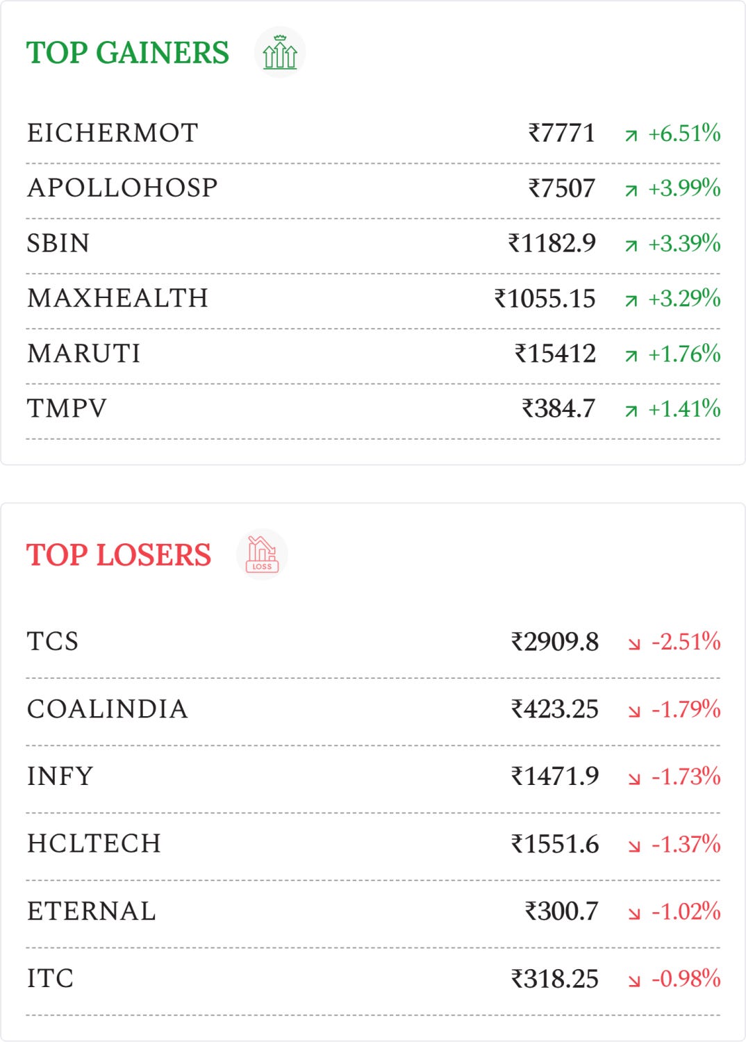 Apollo Hospitals (+3.99%): Shares surged after strong Q3FY26 earnings; EBITDA rose 26.8%, margins expanded to 14.9%, ₹10 interim dividend announced.