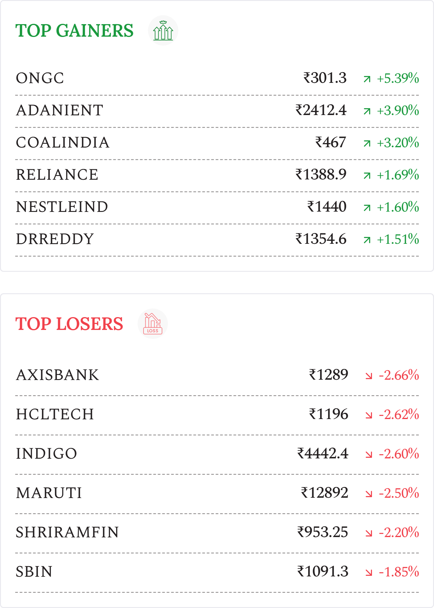 Coal India (+3.20%): Stock gained after Q4; net profit rose 12% YoY to ₹10,907 crore, revenue grew 5% to ₹46,490 crore, and margins improved, though cost pressures persist.