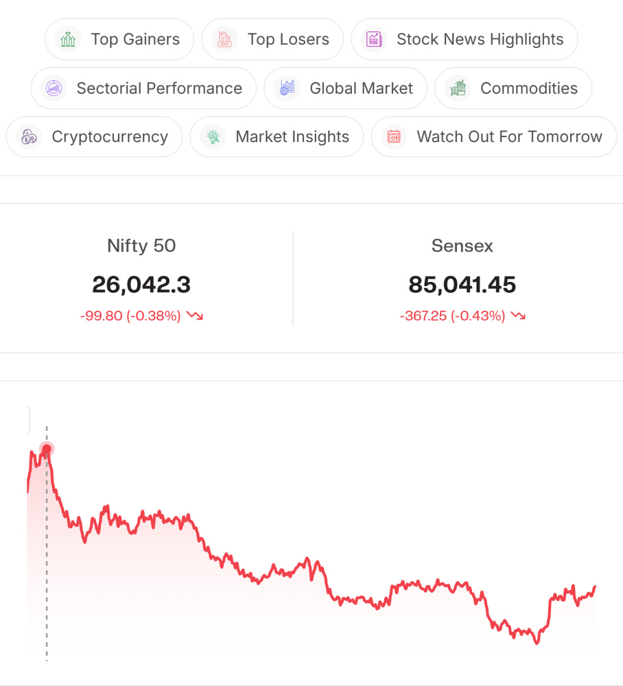 Technical Level: Nifty opened on a soft note around 26,050 and faced sustained selling pressure through the morning, slipping steadily below 26,100. The index found intraday support near the 26,010–26,020 zone, where selling momentum tapered off. A modest afternoon rebound helped Nifty recover part of the losses, but the bounce lacked strength. It finally settled near 26,042, down about 0.38%, reflecting intraday weakness, muted participation, and a market still struggling to regain bullish conviction amid overhead supply.