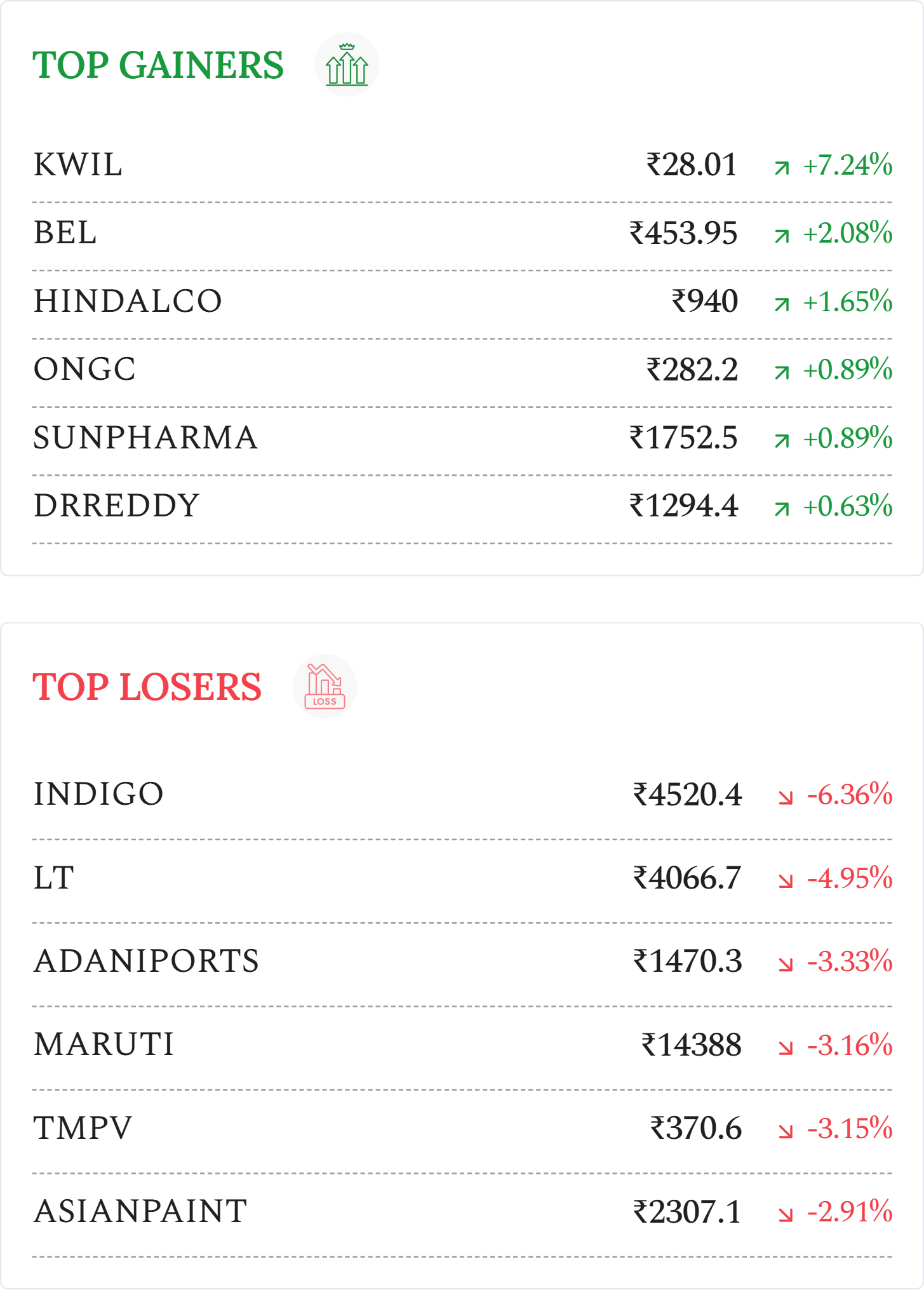 Bharat Electronics (+2.08%): Stock gained after announcing an interim dividend of ₹1.95 per share, while rising Iran–US tensions boosted defence stocks on expectations of higher global orders and stronger future growth visibility.