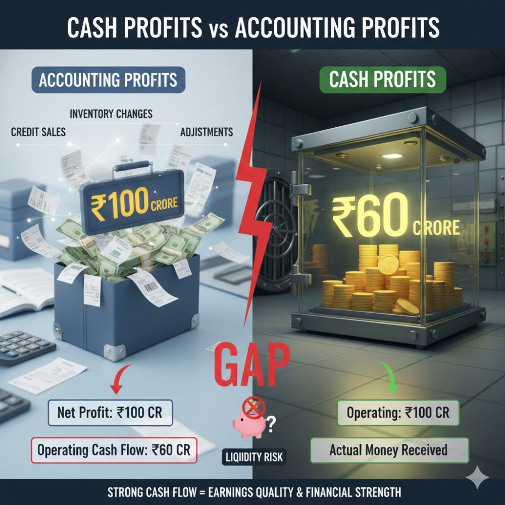 Example: A company reports net profit of ₹100 crore but generates only ₹60 crore in operating cash flow because customers delay payments. This gap indicates profits are not fully backed by cash, increasing liquidity risk.