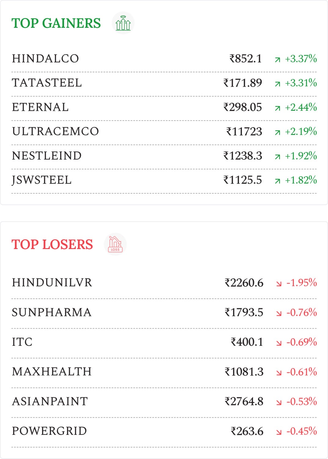 Metal | Nifty Metal (+2.63%): Sector rose as metal stocks like Hindustan Copper and Hindustan Zinc climbed up to 8% on China’s fiscal stimulus, weaker US dollar, and Fed rate-cut cues.