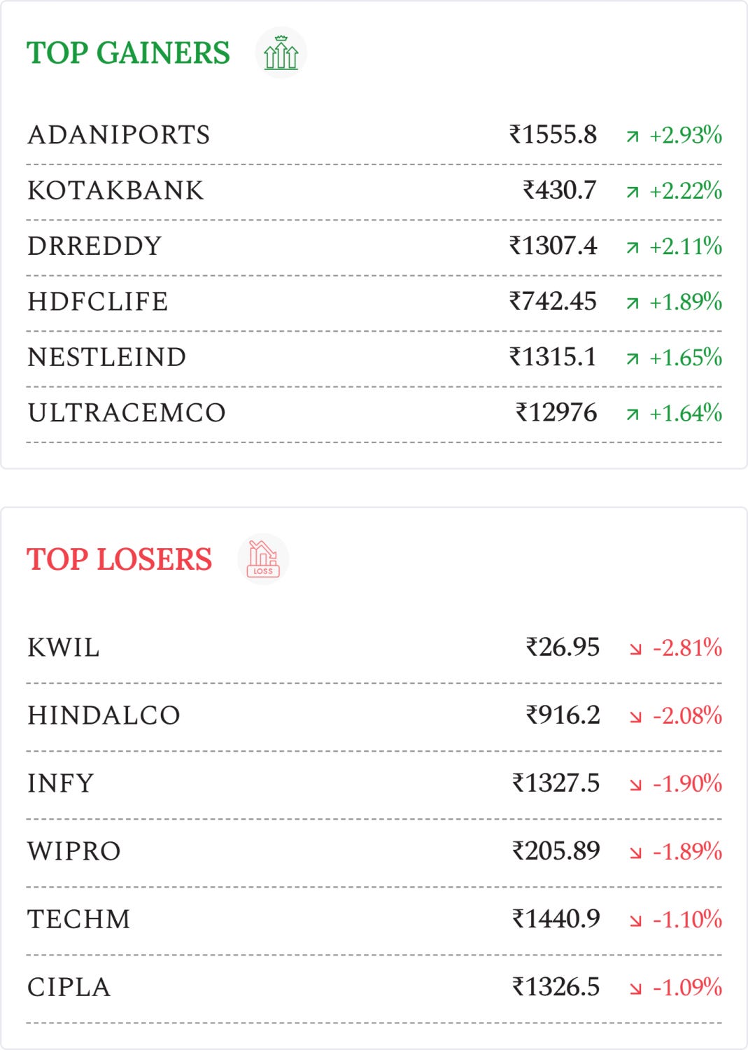 RailTel Corporation of India (+1.93%): Stock surged after receiving ₹1,136 crore LoI with Ashoka Buildcon from Maharashtra Government for IGR office modernization, boosting order book visibility.