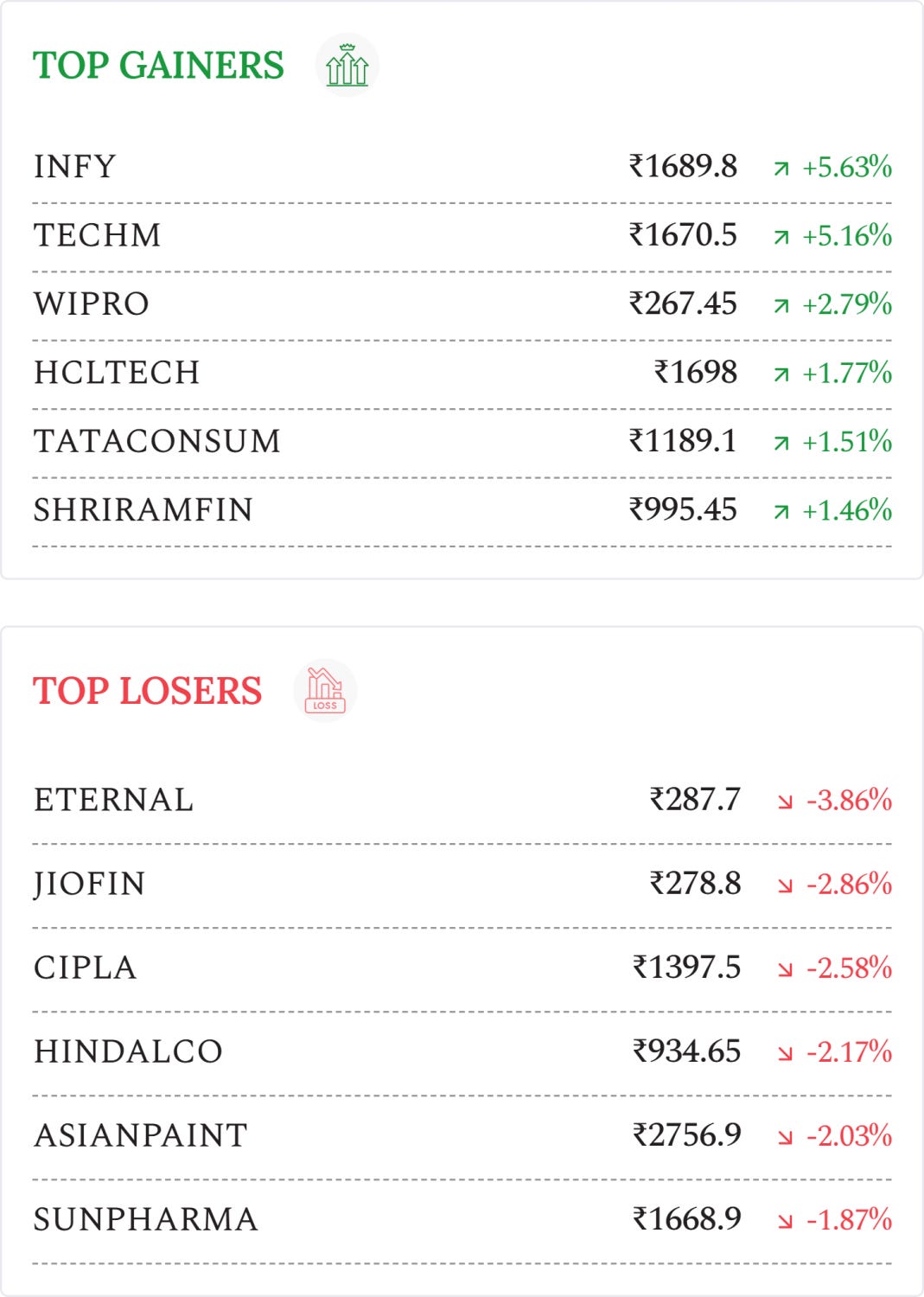 Infosys (+5.63%): Stock rose after strong revenue momentum; Q3 YoY profit fell 2.2% to ₹6,654 crore, revenue grew 8.9% to ₹45,479 crore, EBIT rose 6.4% to ₹9,479 crore, margin slipped to 20.8%.