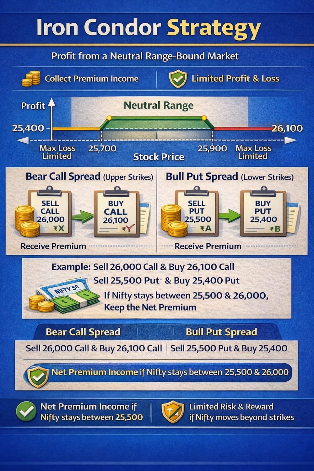 Example: Sell Nifty 25,500 put, buy 25,400 put, sell 26,000 call, buy 26,100 call. If Nifty stays between 25,500 and 26,000 at expiry, all options expire worthless, and you keep the net premium. Losses occur only if Nifty moves outside the outer strikes, but the loss is limited by the long options.