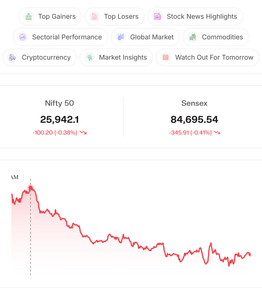Technical Level: Nifty opened weak near the 26,050 zone and quickly slipped into a steady intraday downtrend, forming lower highs and lower lows through the morning. Selling pressure intensified below 26,000, with the index bottoming out around 25,930–25,940, where demand finally emerged. A mild post-noon recovery followed, but repeated failures near the 25,980–26,000 band capped upside attempts. Momentum indicators stayed subdued, and the rebound appeared more corrective than impulsive. Nifty ended near 25,950, down about 0.38%, reflecting persistent distribution, lack of follow-through buying, and continued supply overhead keeping bulls on the defensive.