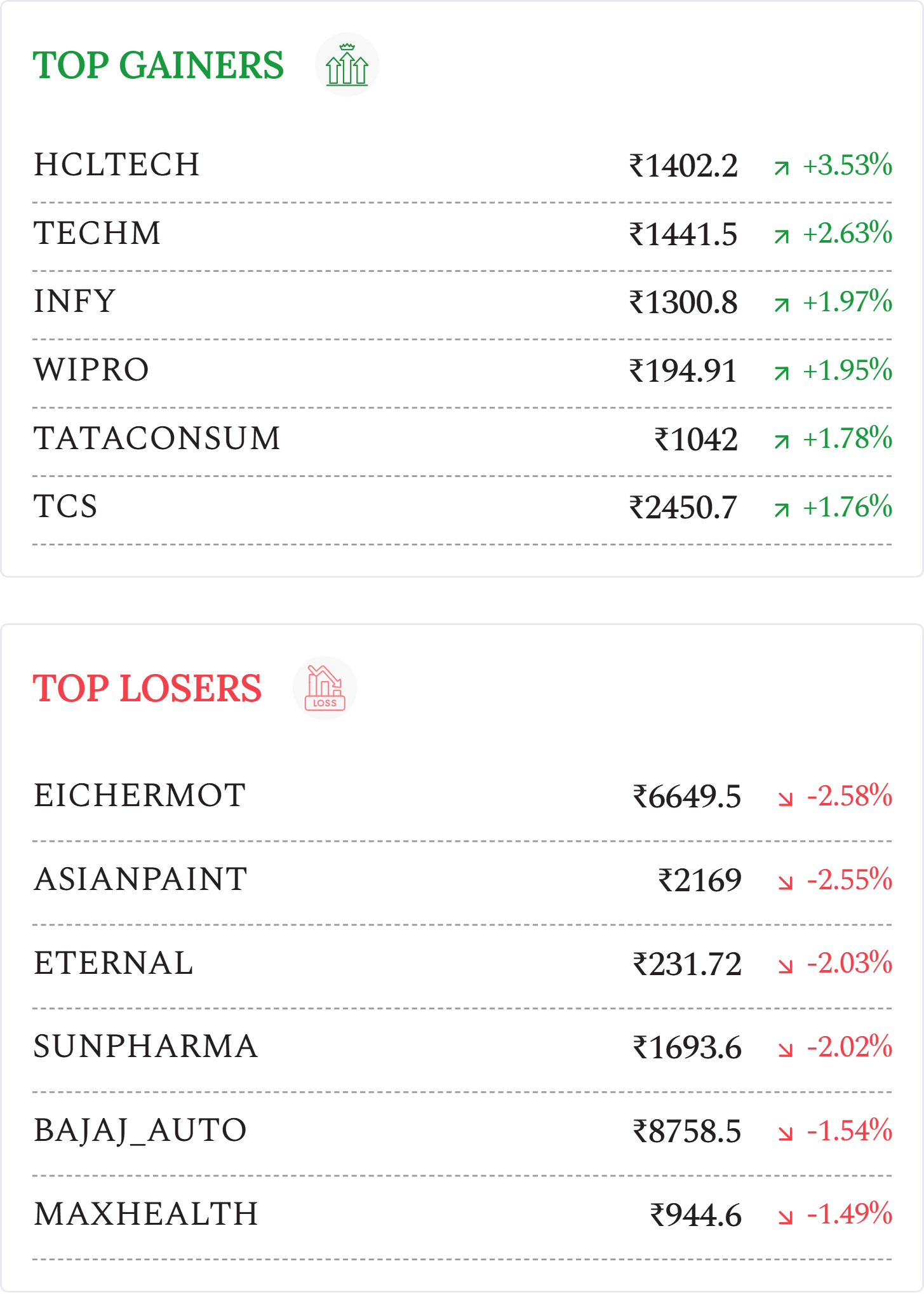 IT | Nifty IT (+2.60%): Sector rallied as the top performer, led by strong heavyweights like HCL Tech, Infosys, and TCS, lifting broader market sentiment and recovering sharply from its two-day slump.