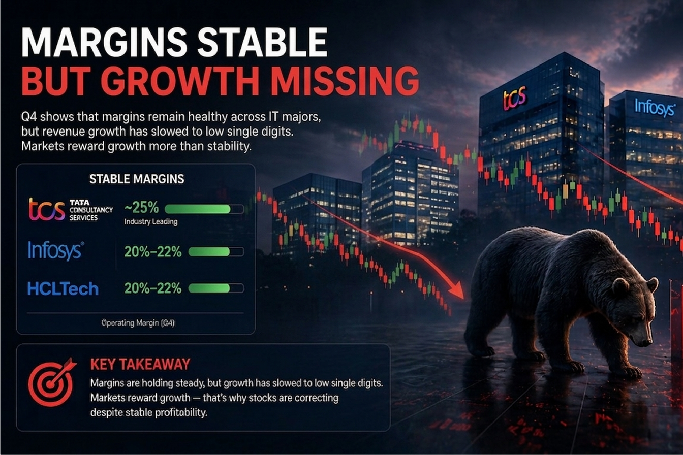 One of the key takeaways from Q4 is that margins remain stable even as growth slows. TCS continues to operate at industry-leading margins of around 25%, while Infosys maintains margins in the 20–22% range. HCL Tech also remains within a similar band.