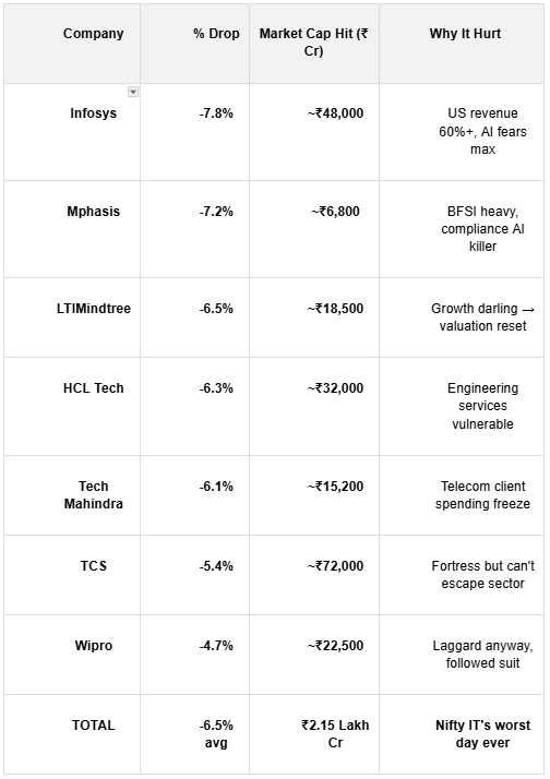 Imagine this: Monday morning, you open your portfolio app expecting the usual steady green from your IT holdings – those reliable names that have been portfolio anchors for years. Instead, you see red arrows everywhere. Infosys down 7%, LTIMindtree down 6%, TCS sliding 5%, the entire Nifty IT index plunging over 7% in a single day. ₹2 lakh crore wiped out in hours. Social media explodes with panic: “Is IT dead? Is AI eating their lunch?”