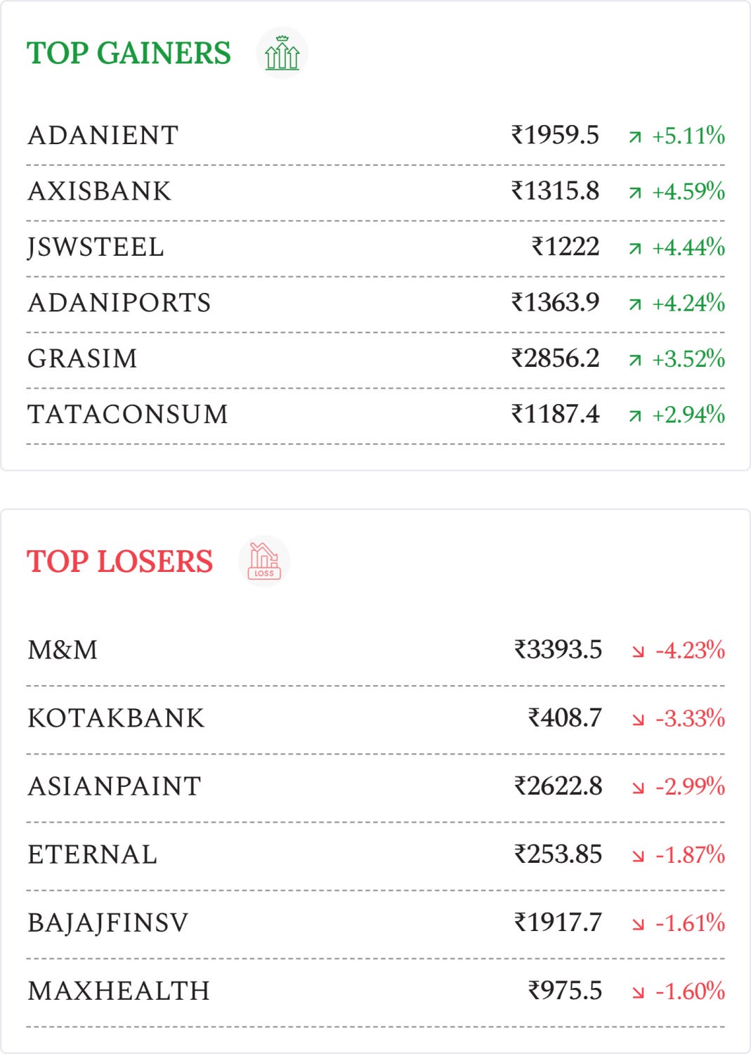 Adani Enterprises (+5.11%): Shares jumped to ₹1,974 after Adani Defence raised its stake to 72.8% and announced an aircraft manufacturing pact with Brazil’s Embraer in India.