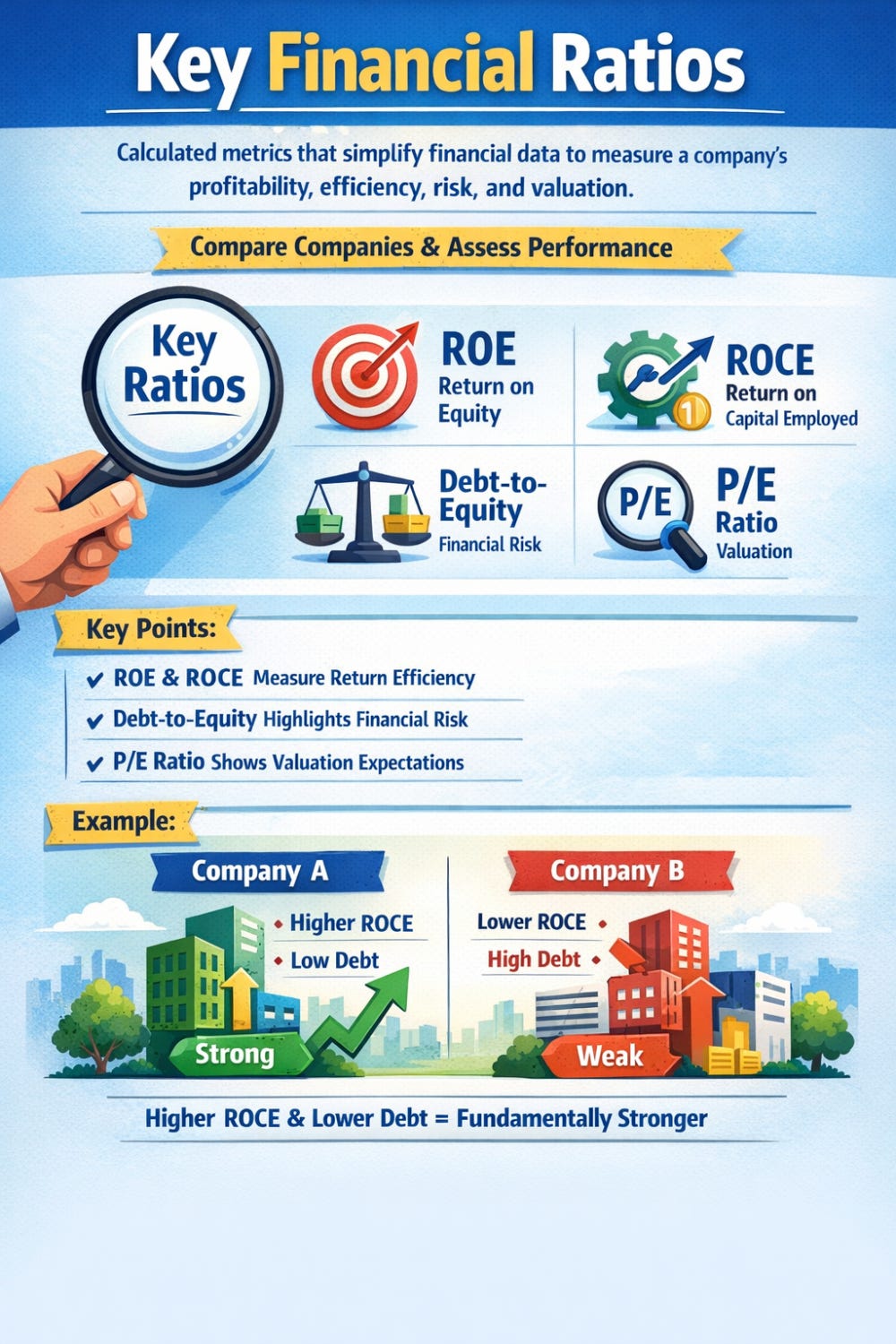 Key Points: Ratios like ROE and ROCE measure return efficiency, Debt-to-Equity highlights financial risk, and the P/E ratio indicates valuation expectations. These ratios help investors quickly identify fundamentally strong and weak companies.