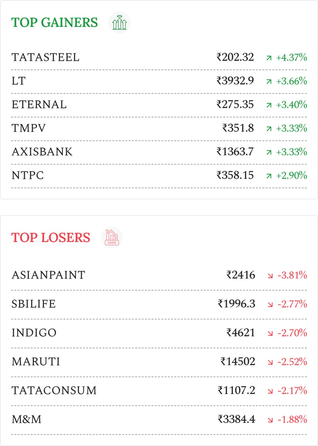 Larsen & Toubro (+3.66%): Stock rose after the company reported 10.5% YoY revenue growth and margin expansion in Q3, despite net profit declining 4.3% YoY, with a strong order book of ₹7.33 lakh crore.