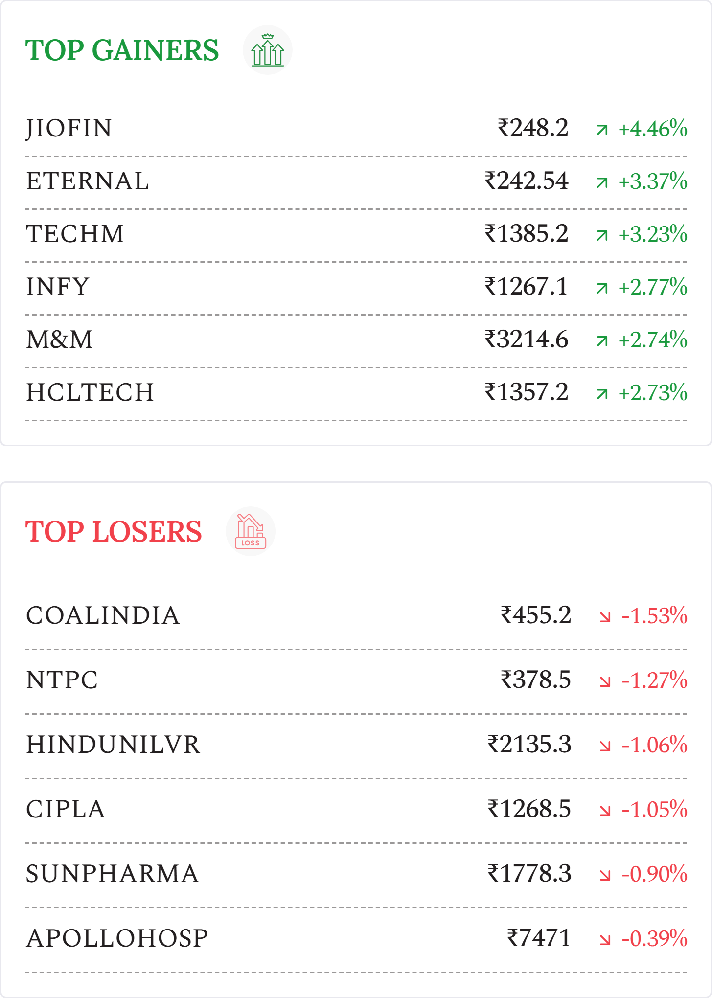 Tech Mahindra (+3.23%): Stock rose after its subsidiary agreed to acquire a 20% stake in Tech Mahindra Arabia from Midad for ₹2.06 billion, strengthening Middle East presence.