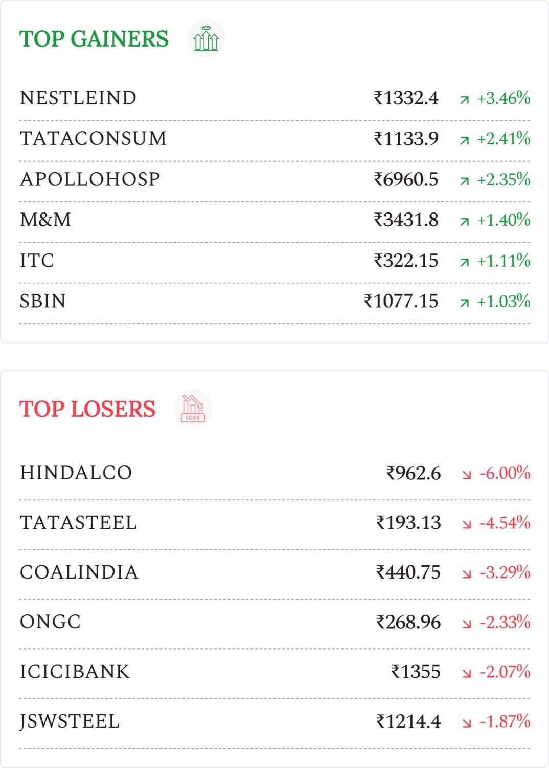 Nestlé India (+3.46%): Stock rose to a 52-week high as Q3 PAT surged 46% to ₹1,018 crore and revenue increased 19% to ₹5,667 crore, supported by strong volume growth.