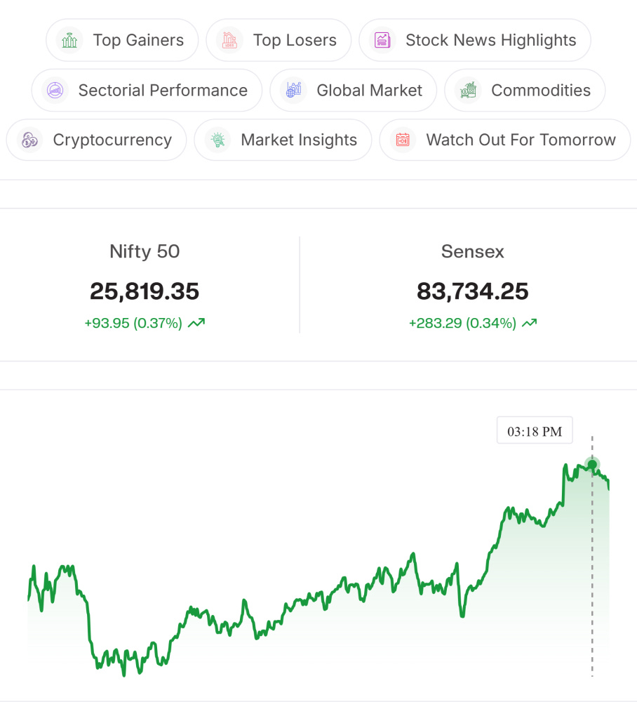Index Watch: Nifty closed near 25,820, facing resistance around 25,830. Trend remains positive with higher highs and higher lows. For tomorrow, 25,740 is crucial support; holding above it may push the index toward 25,900. A break below 25,740 could trigger profit booking toward 25,700–25,650 levels.