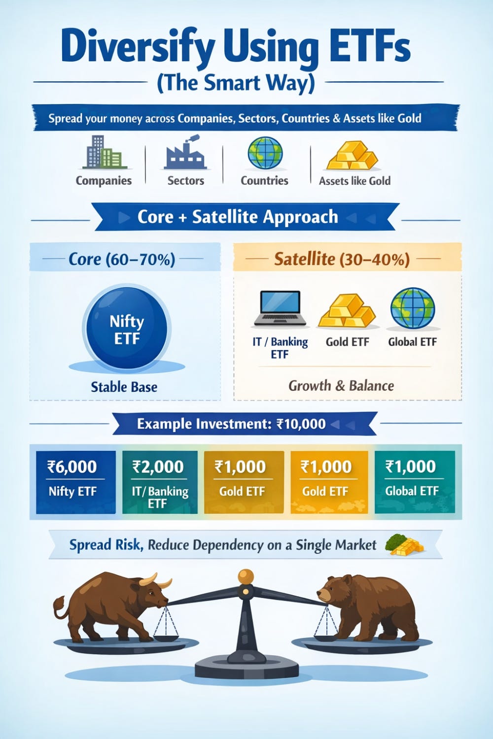 Example for ₹10,000: ₹6,000 in Nifty ETF ₹2,000 in IT/Banking ETF ₹1,000 in Gold ETF ₹1,000 in Global ETF