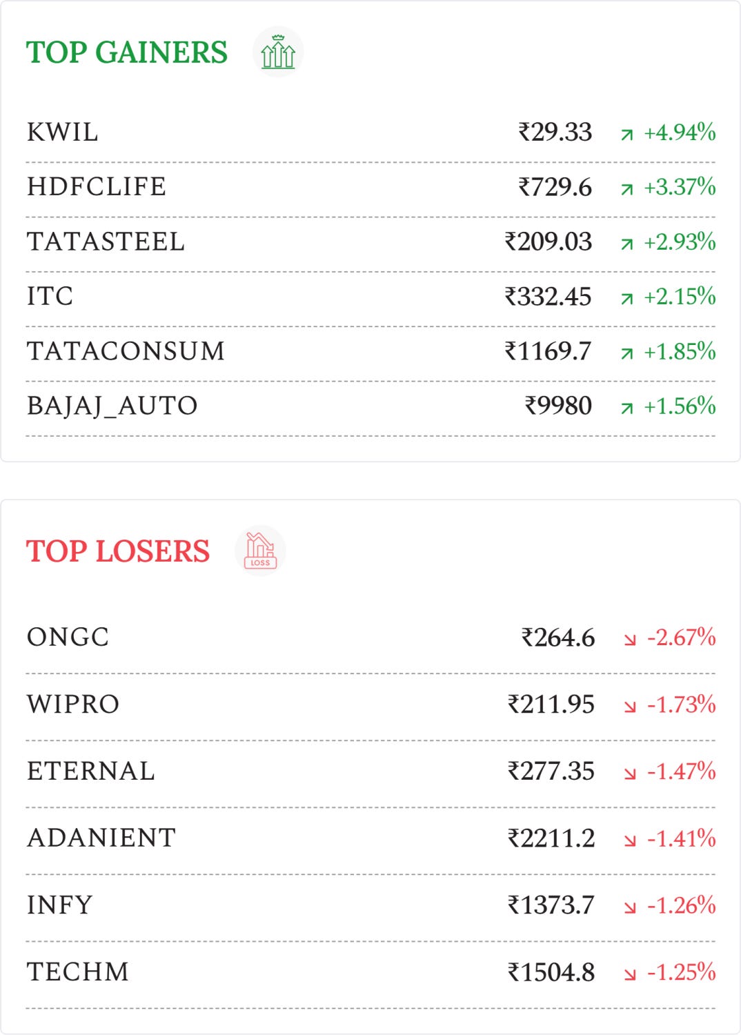 Eternal (-1.47%): Stock falls after the company announced partnership with OpenAI is expected to accelerate AI deployment across platforms like Zomato and Blinkit, boosting growth prospects.