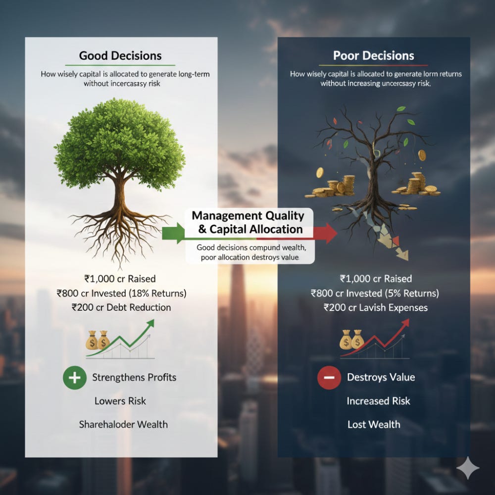 Management quality is reflected in how wisely capital is allocated to generate long-term returns without increasing unnecessary risk. Good decisions compound shareholder wealth, while poor allocation destroys value.