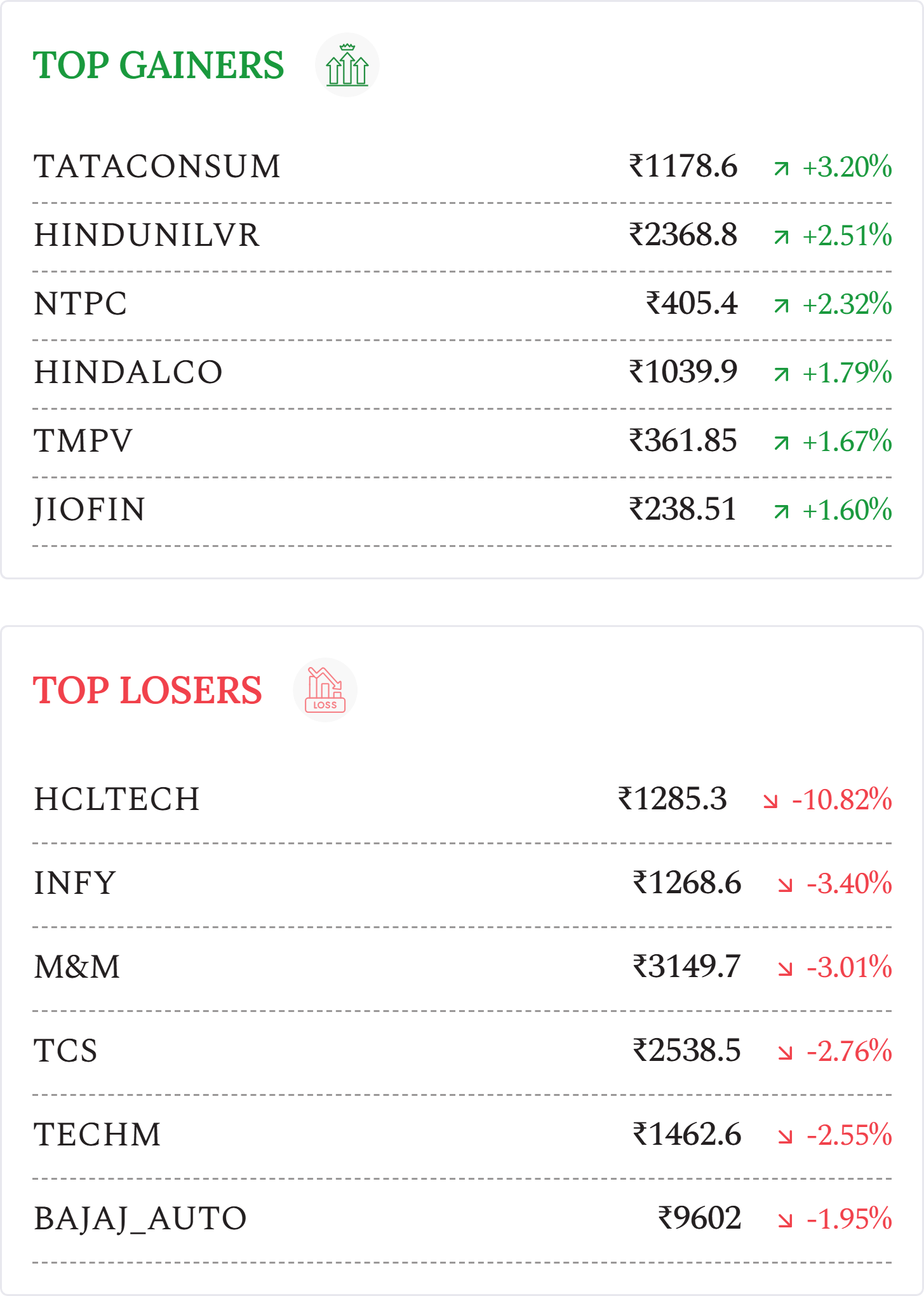 HCL Technologies (-10.82%): Stock declined sharply after Q4; net profit rose 4.2% YoY to ₹4,488 crore, revenue up 12.3% to ₹33,981 crore. Weak FY27 guidance (1–4% growth) kept outlook cautious.