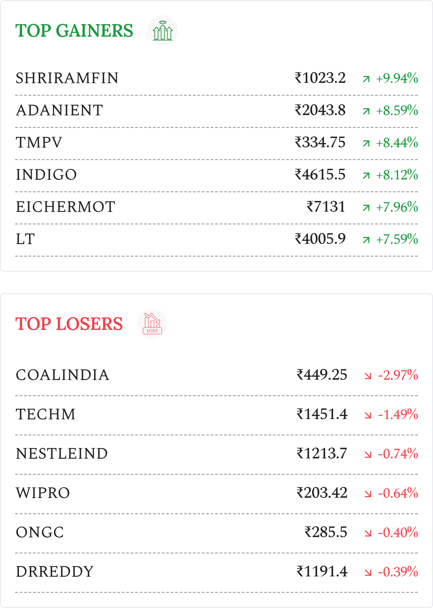 Realty | Nifty Realty (+6.75%): Index surged for fourth consecutive session, led by DLF, Phoenix Mills, and Lodha Developers, supported by RBI’s stable interest rate outlook and improved sentiment.