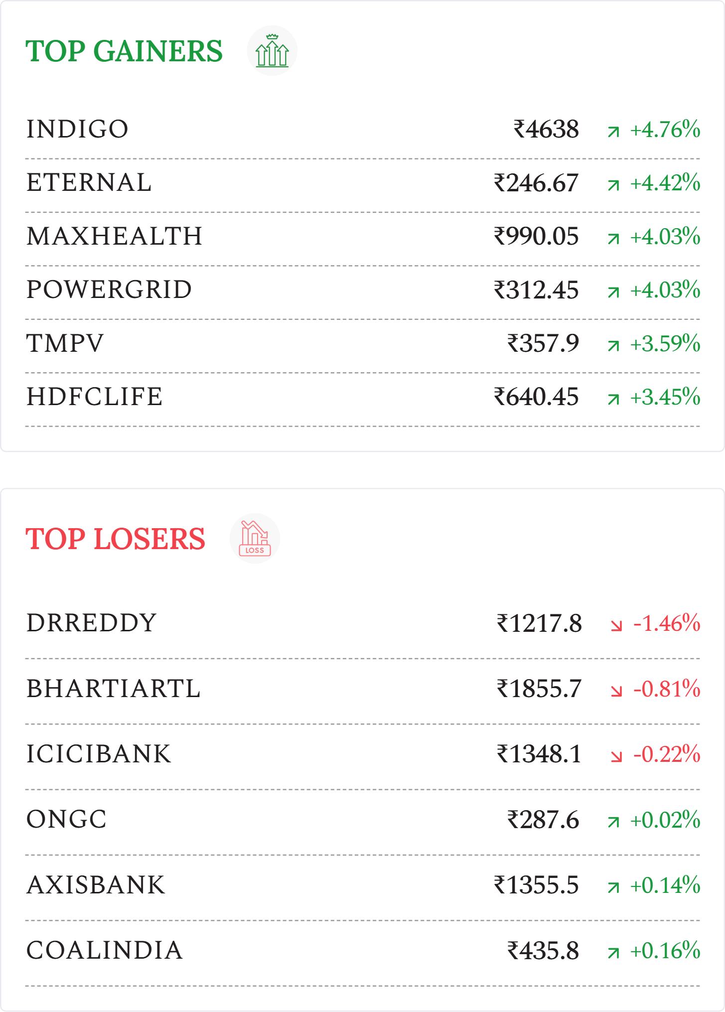 HG Infra Engineering (+13.89%): Stock rose sharply after securing ₹519.33 crore Mirzapur Thermal Energy order for civil and railway infrastructure works in Uttar Pradesh.