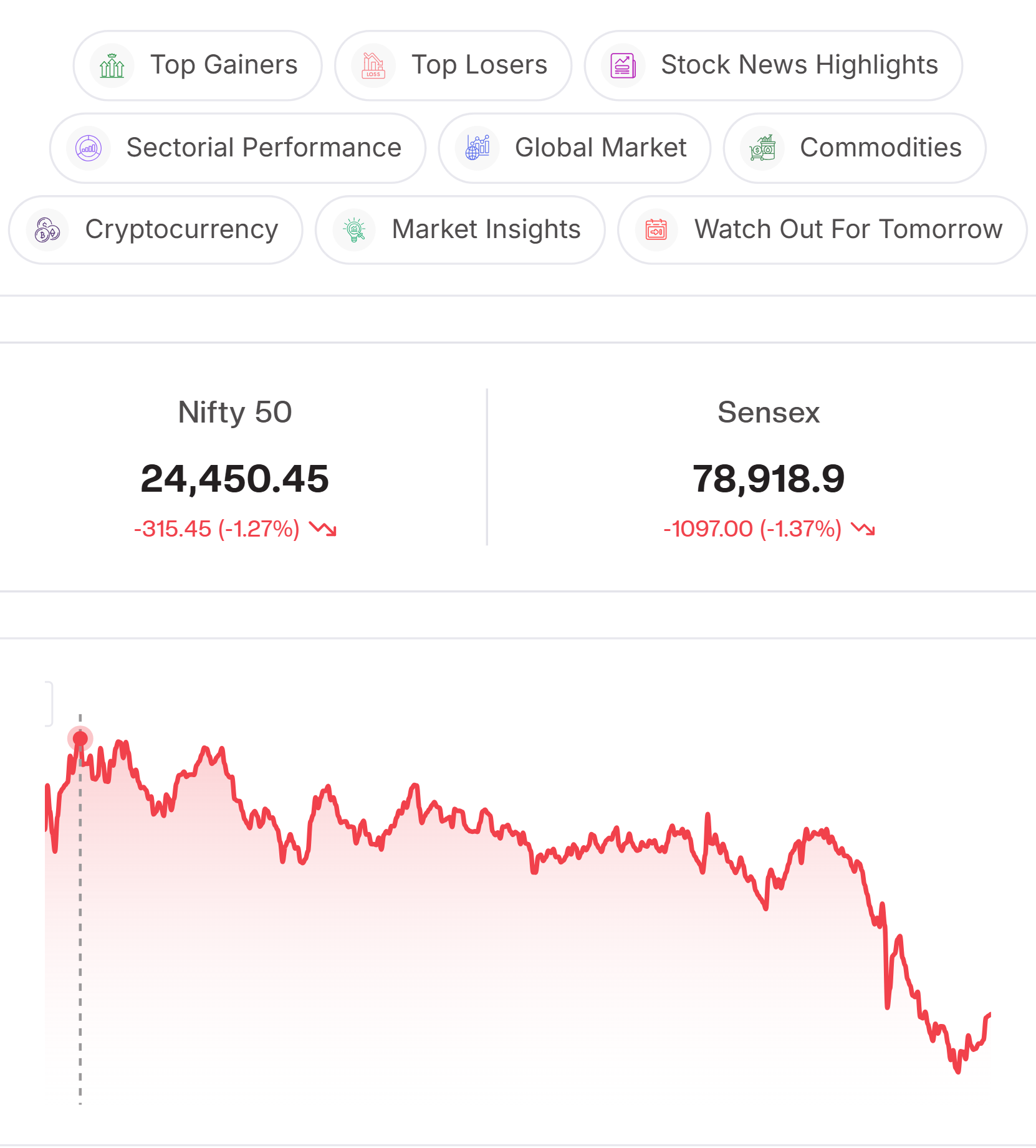 Advance-Decline Ratio: Market breadth remained negative, with 1,315 advancing stocks against 1,872 declining, reflecting broader selling pressure across the market.
