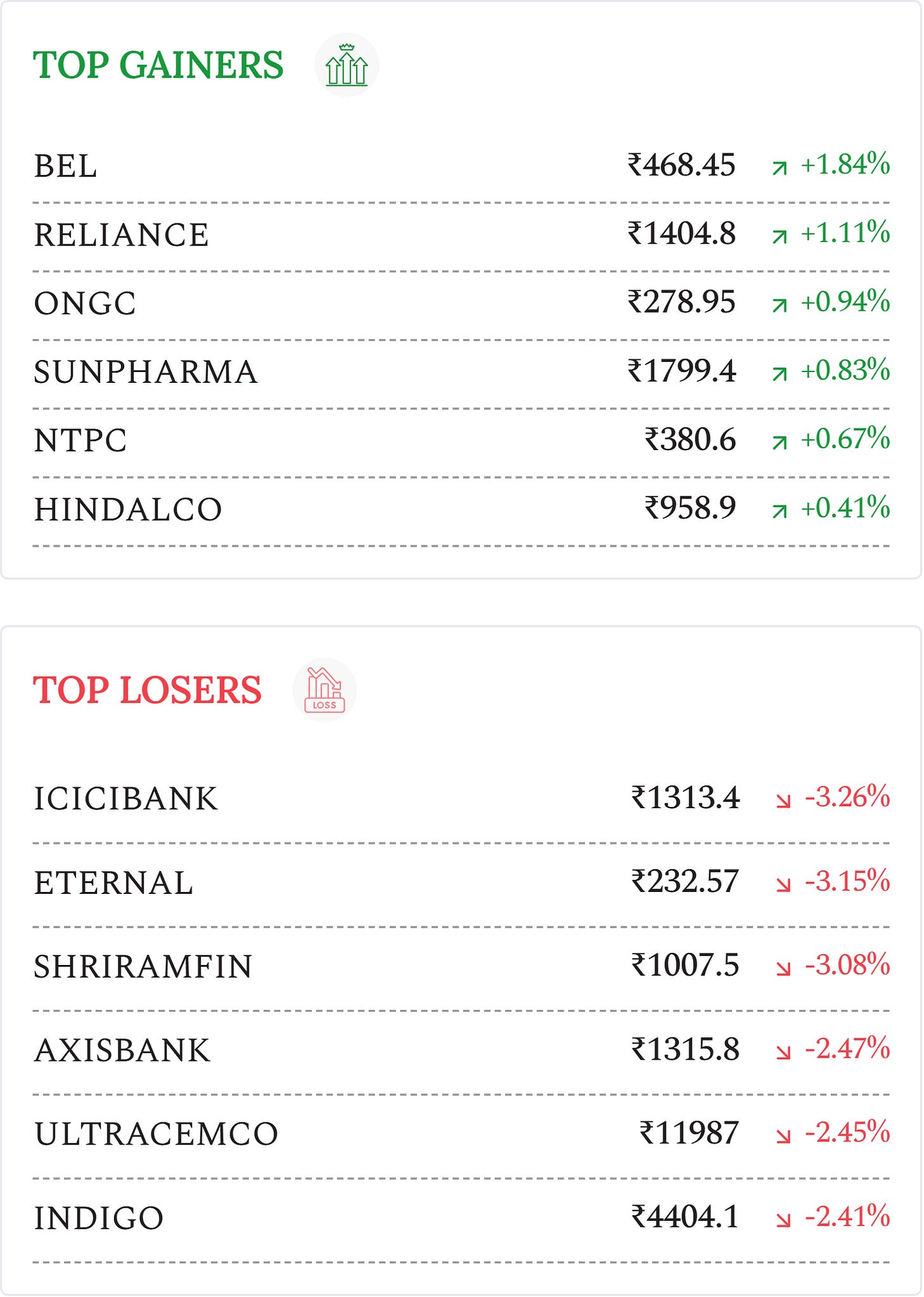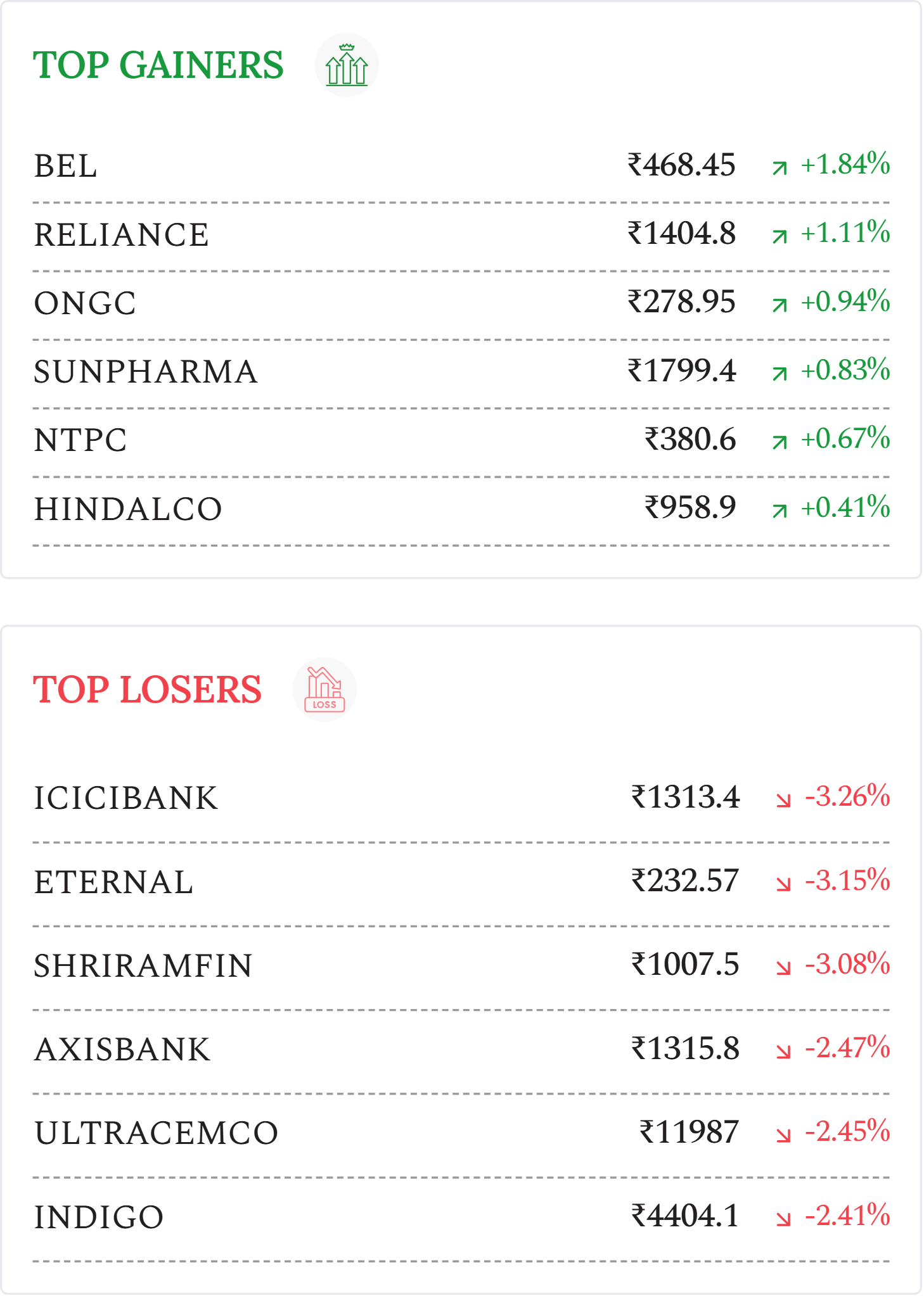 IRCON International (+11.7%): Stock surged amid reports that the government may consider merging the company with RVNL, boosting buying interest in railway PSU stocks.