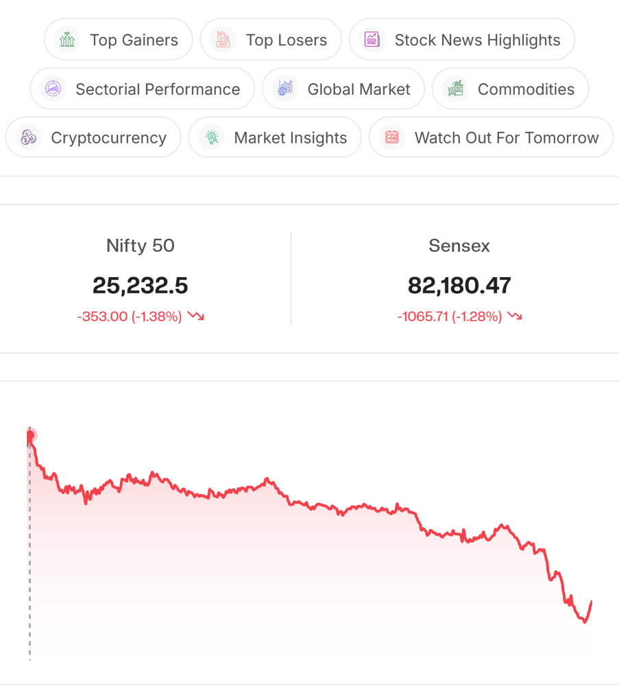 Technical Level: Nifty opened flat but quickly came under selling pressure, forming a strong bearish candle. The downtrend persisted throughout the session, with resistance near 25,580 and support around 25,175, indicating weak sentiment.