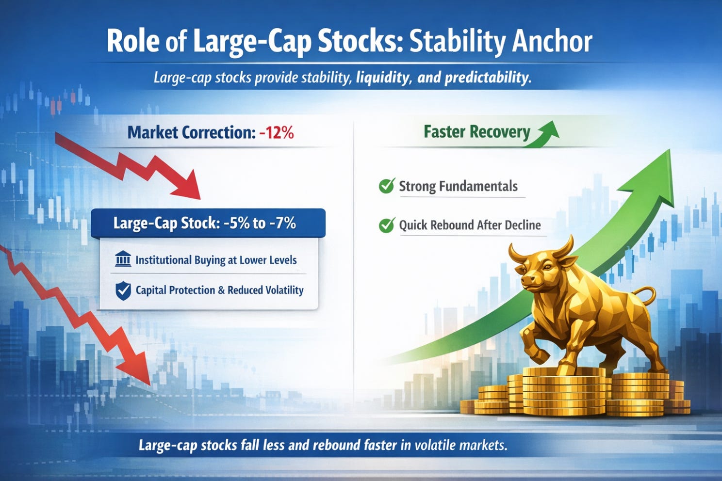 Large-cap stocks bring stability, liquidity, and predictability. They usually fall less during market crashes and recover faster due to strong fundamentals.