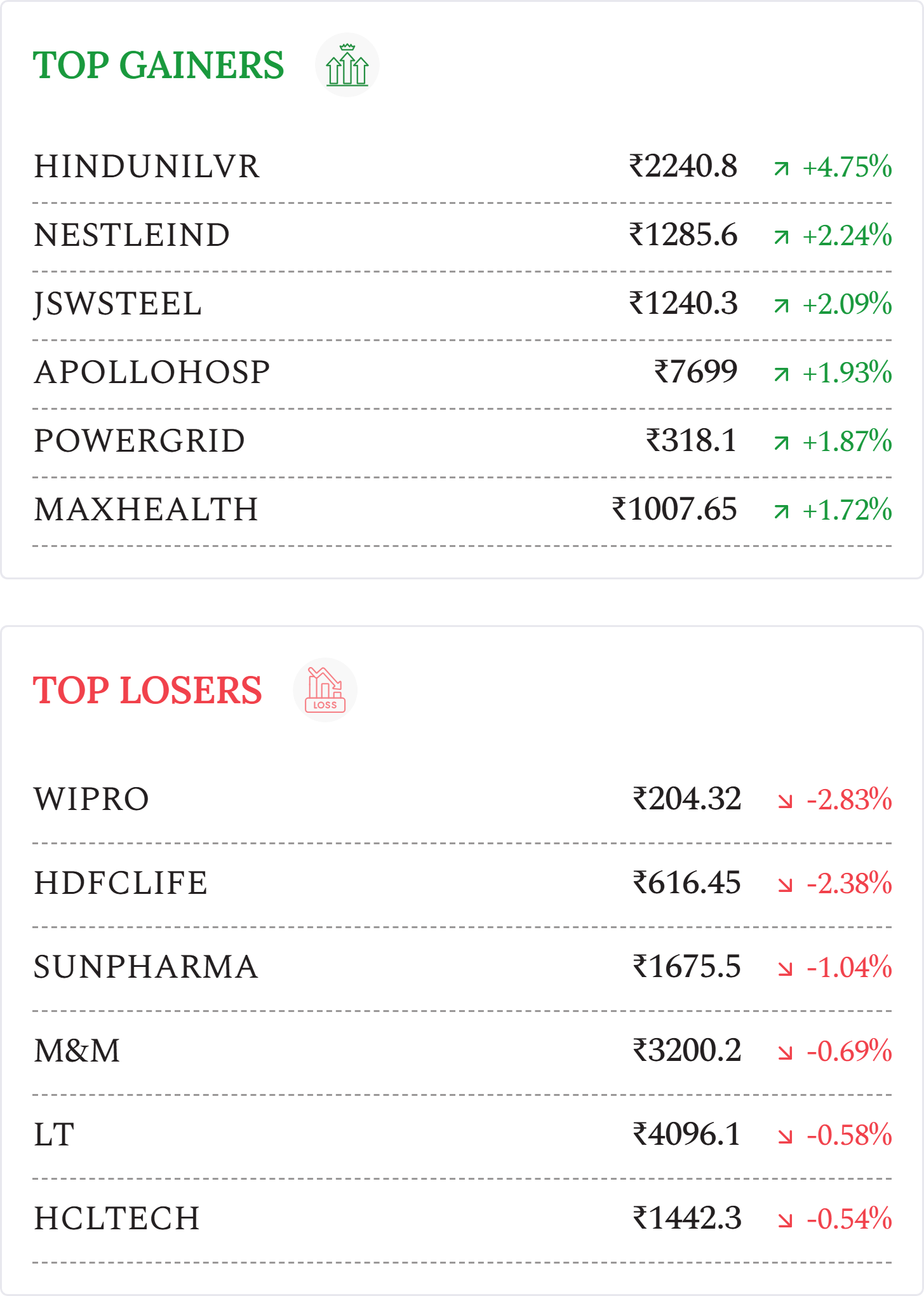 FMCG | Nifty FMCG (+2.65%): Index surged, led by Hindustan Unilever and Colgate Palmolive India, as strong value buying and defensive demand lifted sentiment amid inflation trends and market recovery.