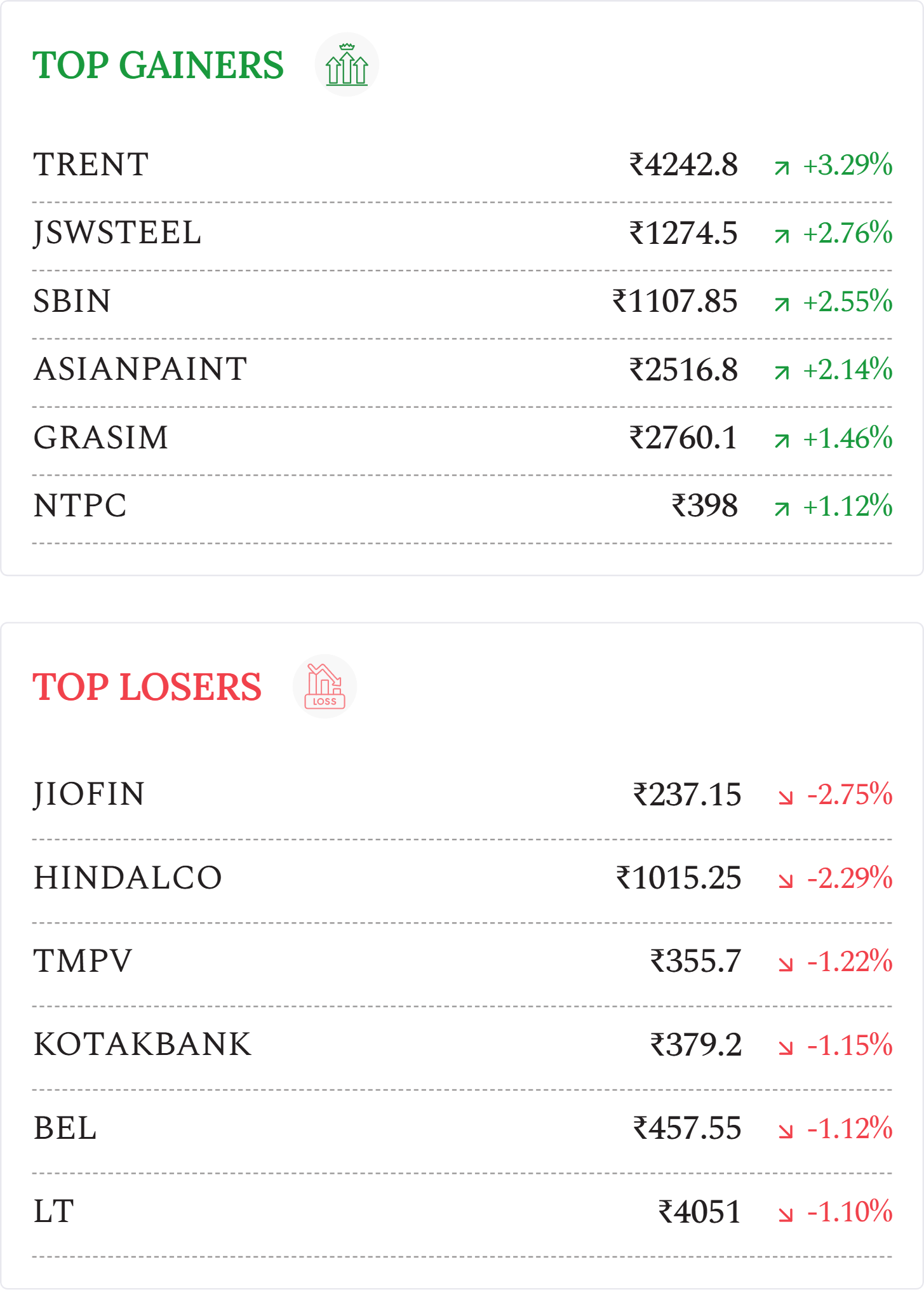 ICICI Bank (+1.10%): Stock rose despite flat market; net profit increased 8.5% YoY to ₹13,702 crore from ₹12,629.6 crore. Bank declared ₹12 dividend.