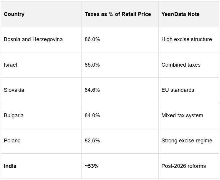 At the same time, the comparison highlights India’s challenge. Many countries with very high tax shares have stronger enforcement, smaller informal markets, and higher average incomes. Without parallel improvements in enforcement, simply raising tax rates risks widening the gap between legal and illegal products. The table therefore shows not just where India stands today, but the careful balance future tax policy will need to strike.