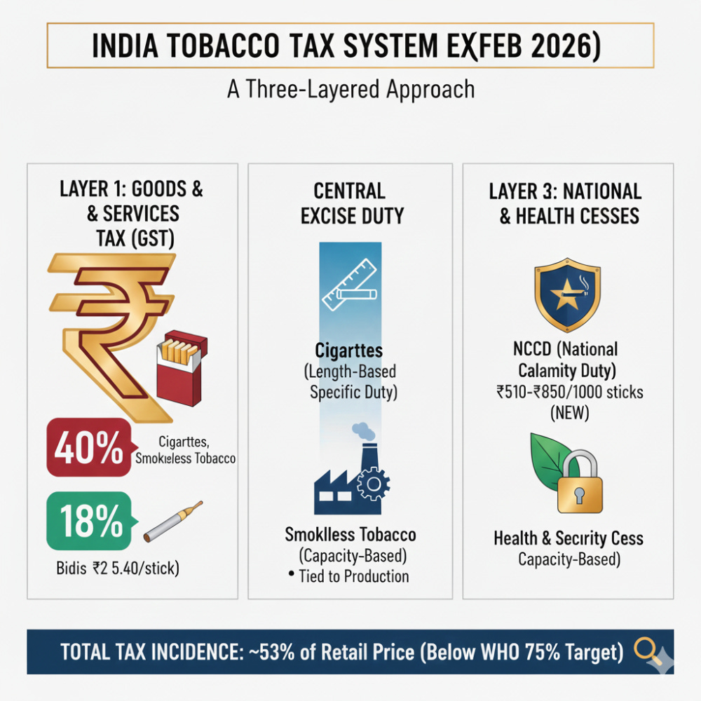 The answer arrived in late 2025. The government created a new 40% GST “sin” slab for demerit goods, including tobacco, and paired it with a redesigned excise framework that took effect from February 1, 2026.