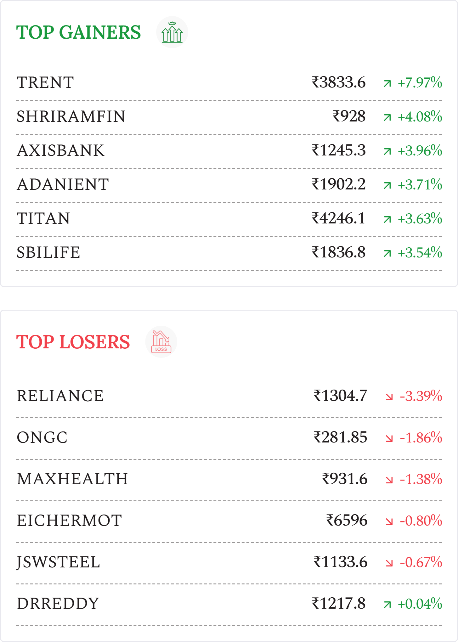 Trent (+7.97%): Stock rallied sharply after ₹4,937 crore Q4 revenue (+20% YoY), ₹510 crore profit, and strong expansion with 198 Zudio, 52 Westside stores boosting growth outlook.