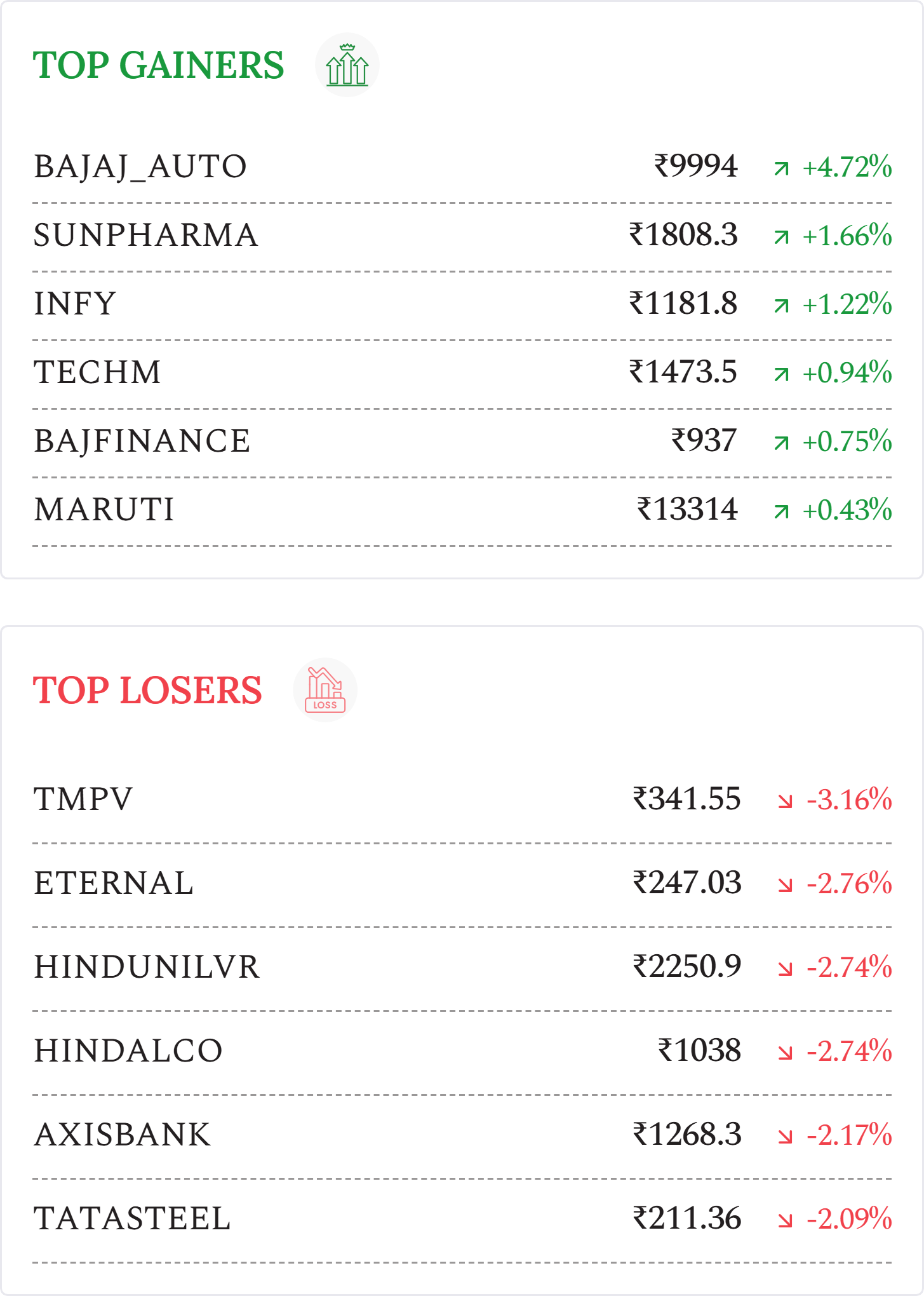 Vedanta Ltd (-64.01%): Stock fell after ex-demerger adjustment to ₹289.5; decline reflects value split into Vedanta Aluminium, Vedanta Power, Vedanta Oil & Gas, and Vedanta Steel, not wealth erosion.