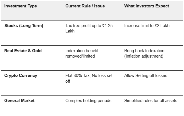 Retail investors value stability and clear rules over frequent changes. In Budget 2026, expectations include a higher long term capital gains exemption to encourage long term investing, reconsideration of indexation benefits for real estate and gold, clearer crypto tax rules including loss set off, and balanced securities transaction tax to keep market participation affordable.